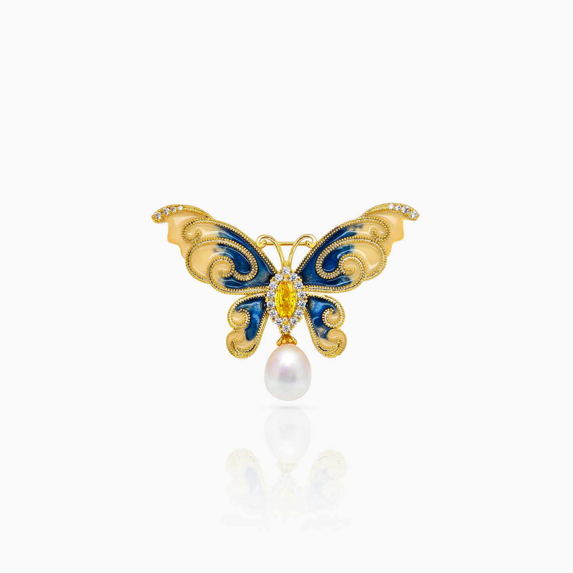 Graceful and enchanting, this Butterfly Charm Pearl Brooch captures the beauty of transformation and elegance. Crafted in radiant gold with blue wings, it sparkles with yellow stone at its center, accented by dazzling crystals. A lustrous drop pearl completes the design, symbolizing purity and timeless sophistication.