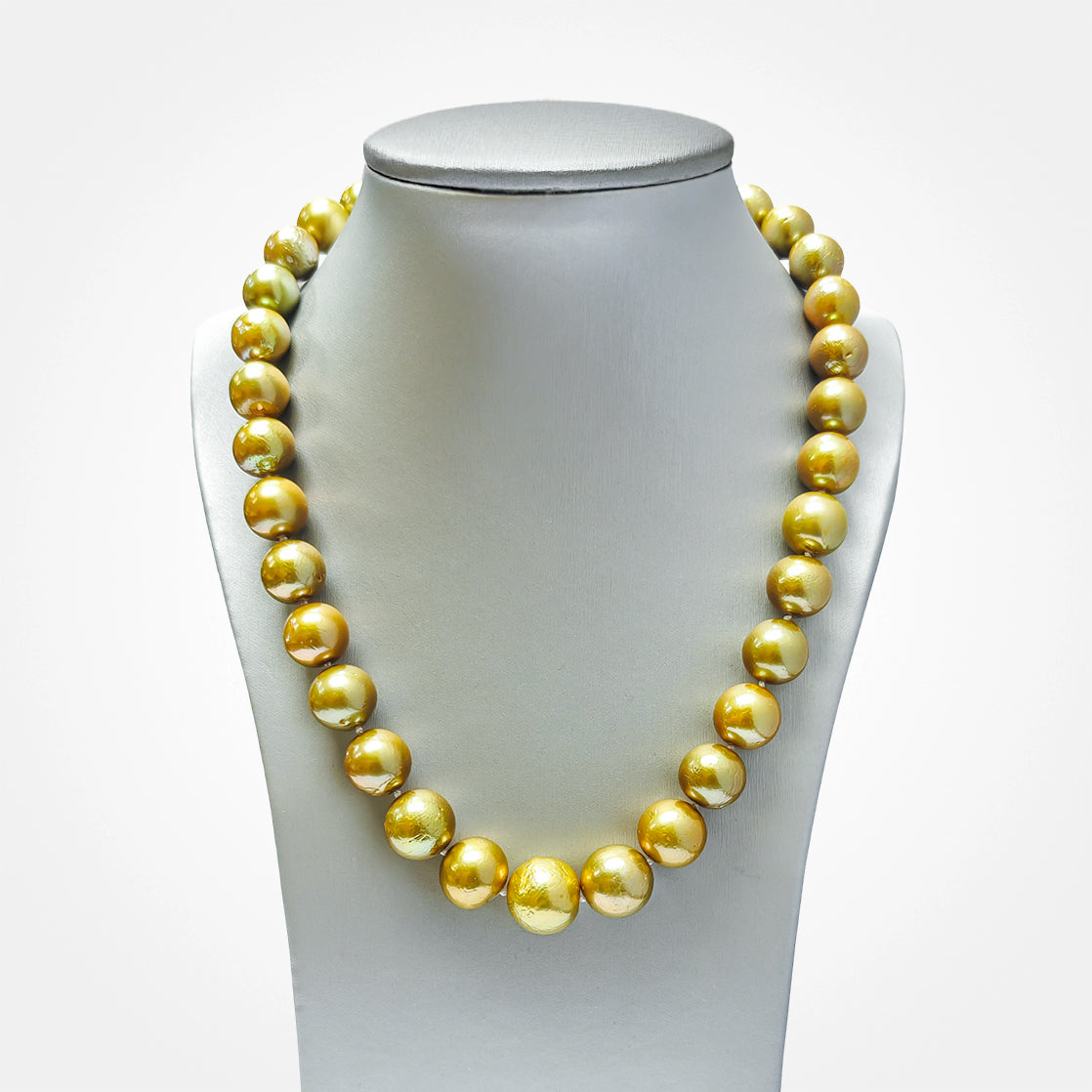 Discover the timeless allure of our luxurious Off Round Gold Pearl Necklace, where opulent design meets refined elegance. This stunning piece showcases an array of 11-15mm gold pearls, each with its own subtle off-round shape, adding a touch of individuality and sophistication.