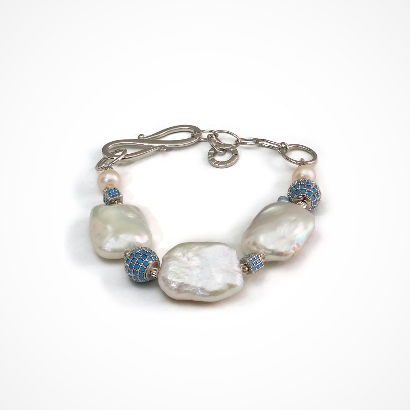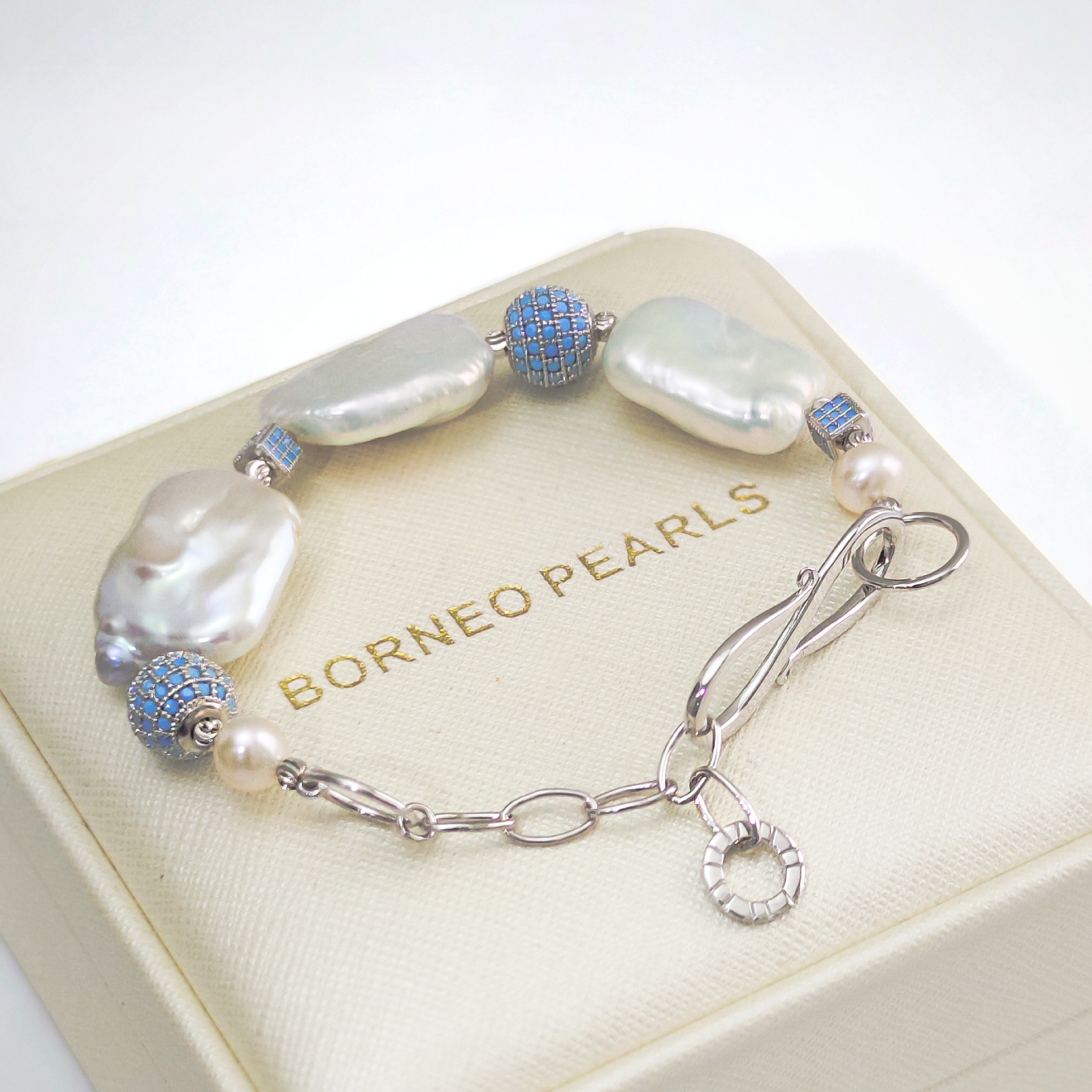 Luminous 17–20mm Biwa pearls paired with dazzling turquoise-encrusted accents. Each irregular pearl is a natural masterpiece, celebrated for its organic form and satiny luster.