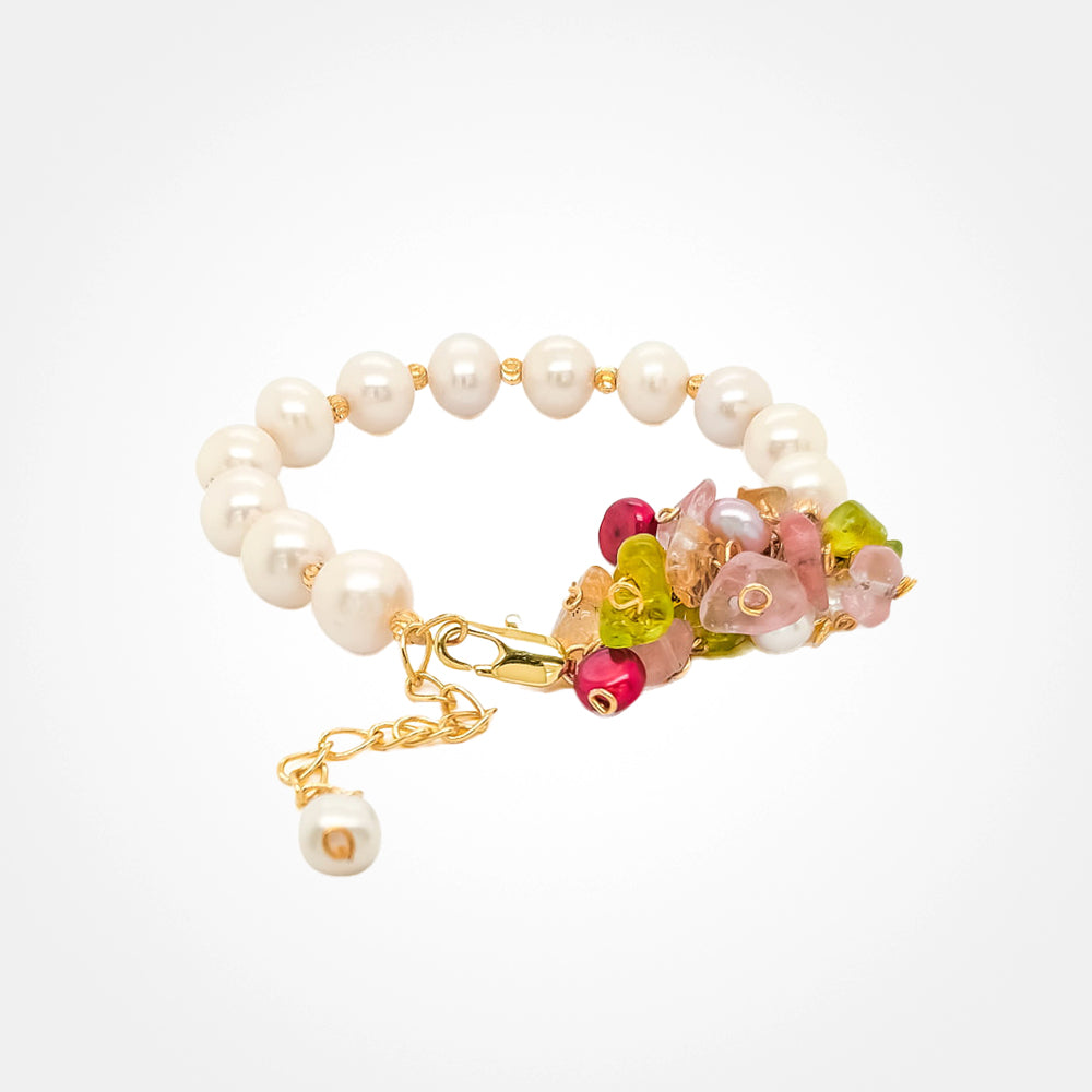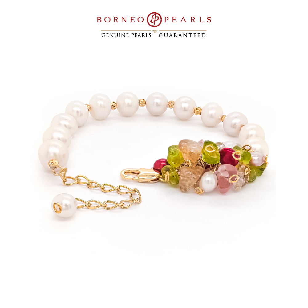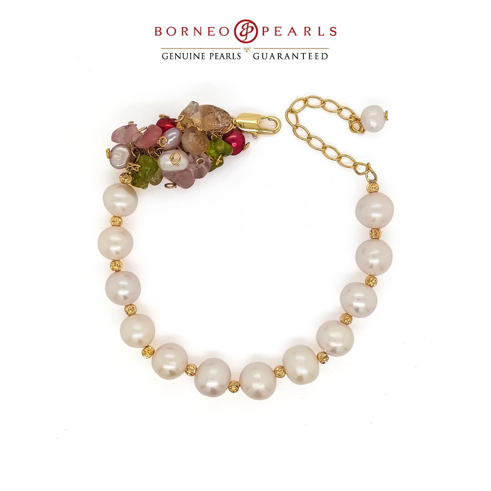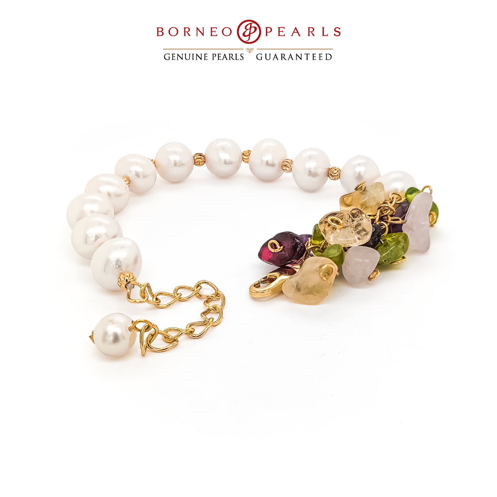 Add a splash of radiant charm to your look with this captivating bracelet featuring 9-10mm potato-shaped freshwater pearls in glowing rainbow hues. Designed in true boho style, the bracelet is adorned with an off-center cluster of assorted genuine gemstones, each carefully chosen for its color and character.