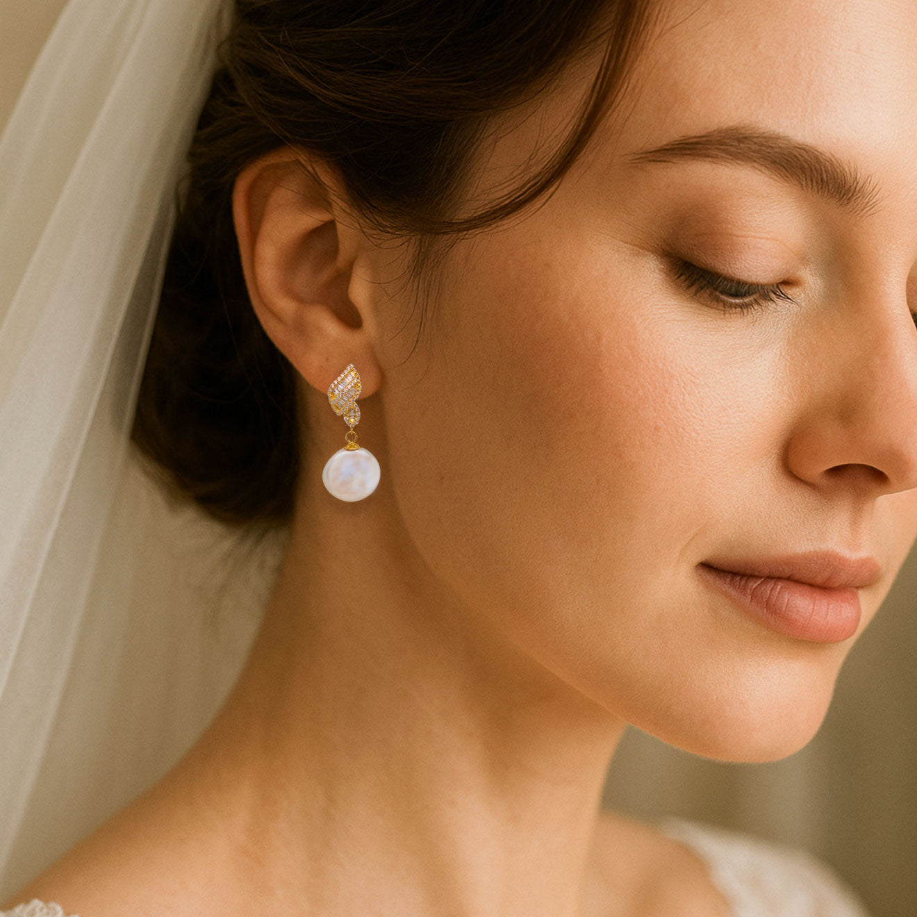 These exquisite bridal earrings feature lustrous 13–14mm coin pearls suspended from a sparkling zirconia-studded design, all set on 925 silver. A perfect balance of classic beauty and contemporary sparkle, this pair is designed to complement bridal gowns and evening ensembles alike.