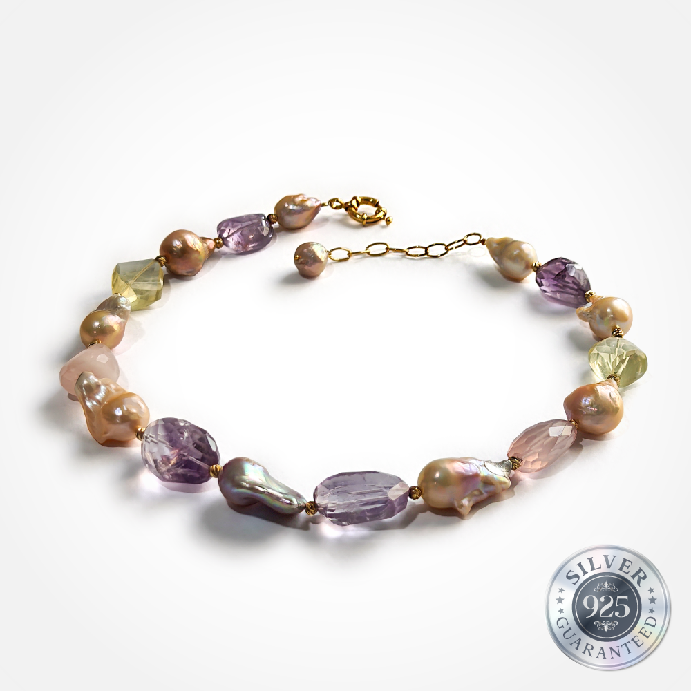 Indulge in the natural beauty of this handcrafted necklace, featuring a striking 14-19mm baroque pearl as its centerpiece and strung on a 925 silver chain, each one unique in shape and rich in character. Accented by the soft blush of rose quartz, the sunny glow of lemon quartz, and the regal depth of amethyst, this piece brings together a refined, feminine palette with effortless grace.