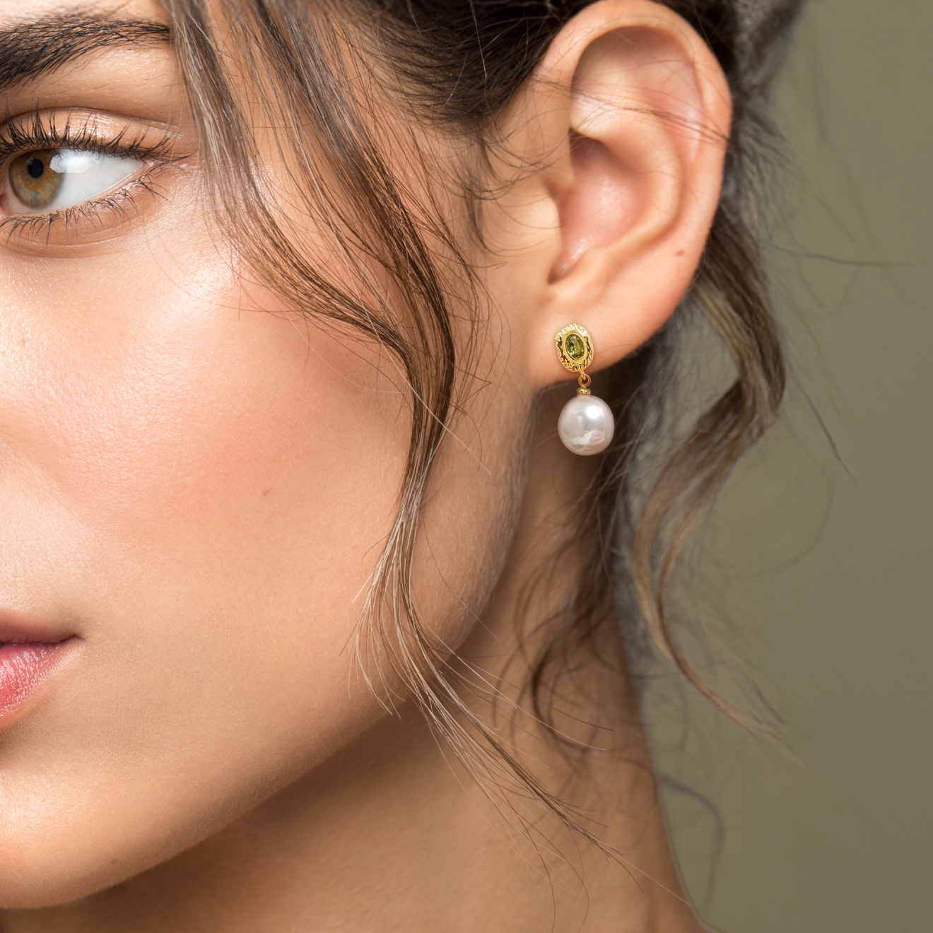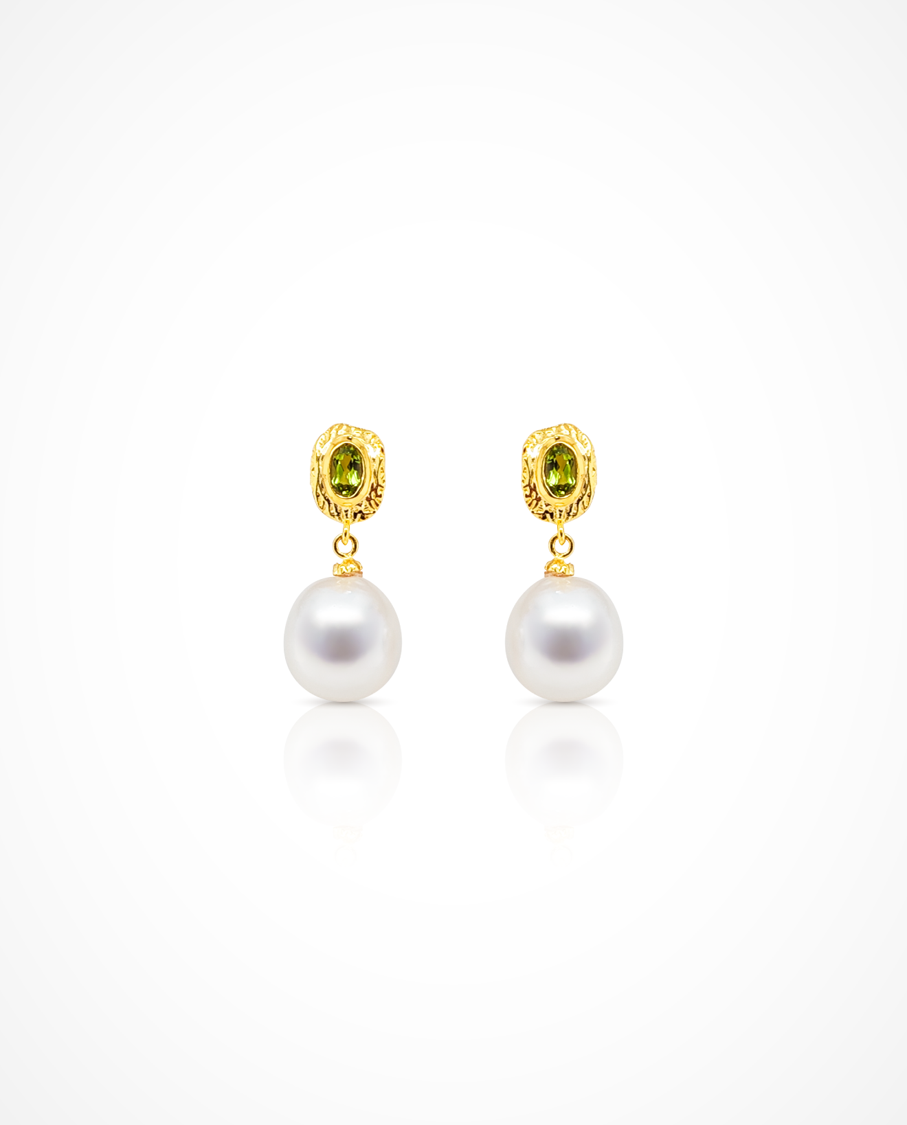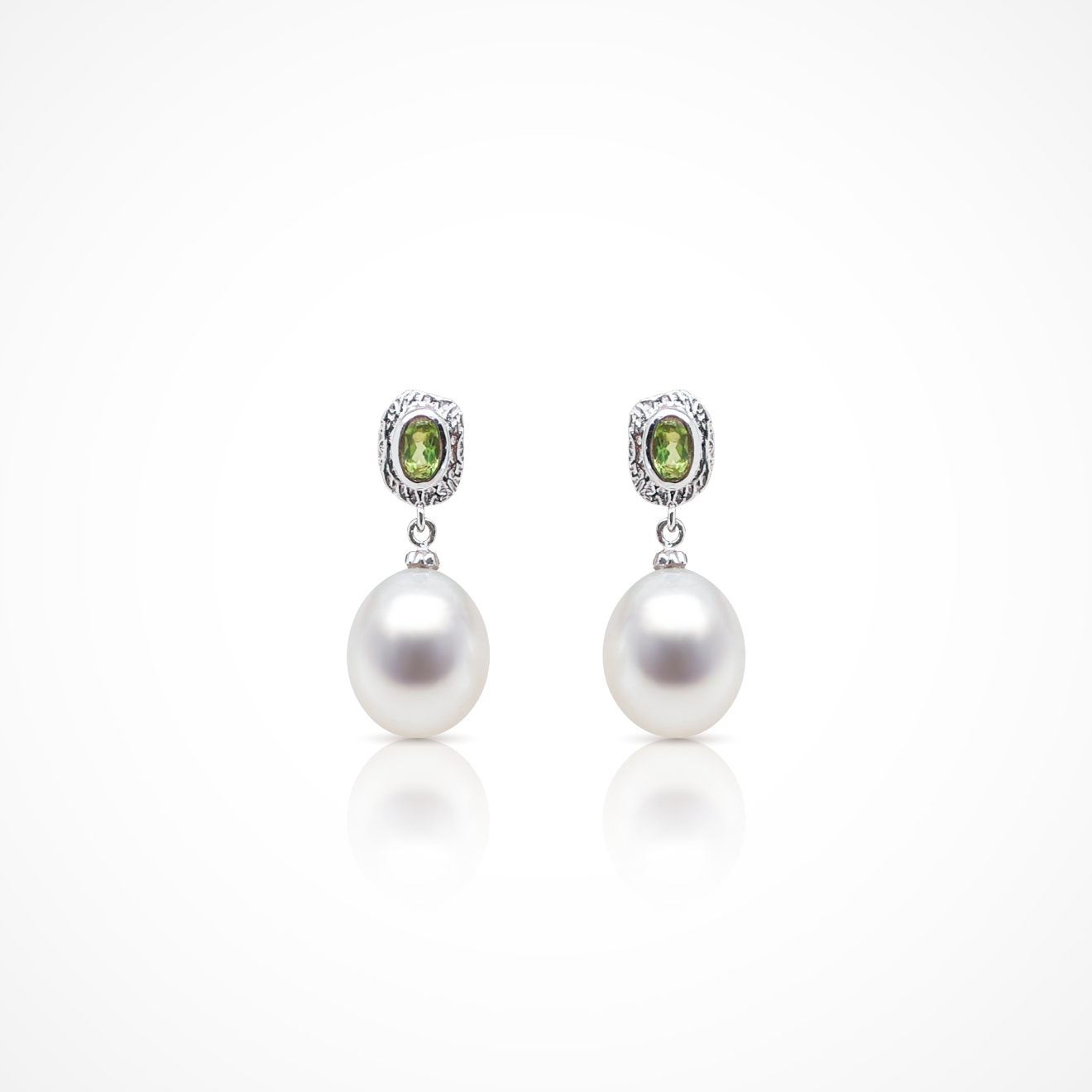 South Sea white pearl earrings featuring luminous 10–11mm pearls set in 925 silver, each piece is accentuated with a sparkling peridot stone for a touch of natural brilliance.